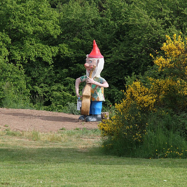 Wie viele andere Institutionen, die auf sich aufmerksam machen wollten, hatten auch die Redakteure der „Kölnischen Rundschau“ auf dem Landesgartenschau-Areal ein Stück Land gemietet, das in einen Vorzeige-Garten verwandelt wurde. Redakteure und Rundschau-Leser arbeiteten an diesem Projekt. Der Hingucker sollte ein Gartenzwerg im Rundschau-Garten werden. Der Künstler Paul Greven wurde auserkoren, diesen zu gestalten. Dieser Auftrag war so gar nicht nach Grevens Geschmack. Doch alles Sträuben half nichts. Schließlich willigte Greven ein, aber zu seinen Bedingungen. Heraus gekommen ist ein über zwei Meter hoher „Zwerg“ in Hawaihemd, der auf einem Cello spielt. Dieses Objekt war dann der Foto-Star während der Landesgartenschau. Danach kam der große Kerl wieder auf den Kunsthof Greven zurück.